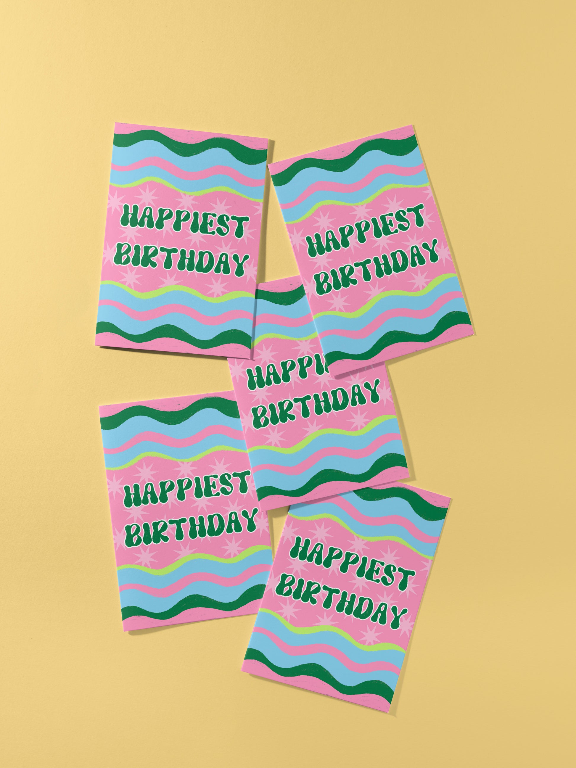 Celebrate in style with this "HAPPIEST BIRTHDAY" card, featuring a sleek and modern design with a unique twist. Ideal for those who appreciate minimalist aesthetics with a touch of personality.