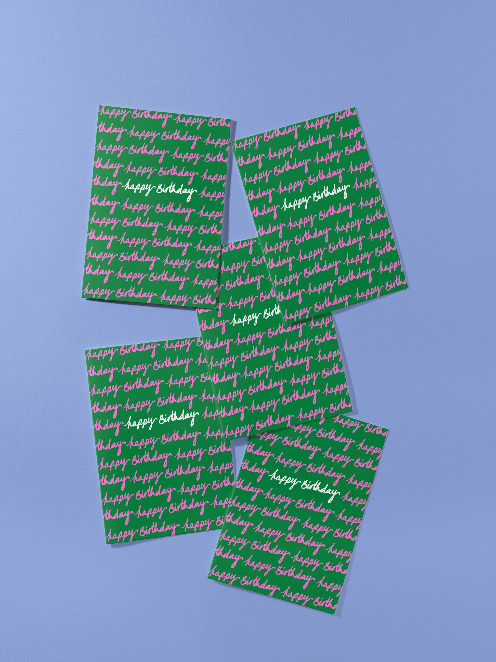 This "Happy Birthday" card features a beautiful script pattern, offering a minimalist yet elegant design.